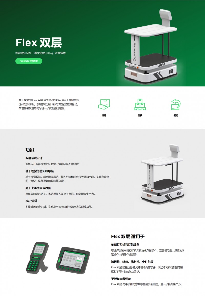 基于視覺的 Flex 雙層 自主移動機器人適用于倉儲中揀選和分揀作業。雙層裝載設計確保貨物存放更加穩妥,在增加裝載量的同時進一步優化搬運路徑。