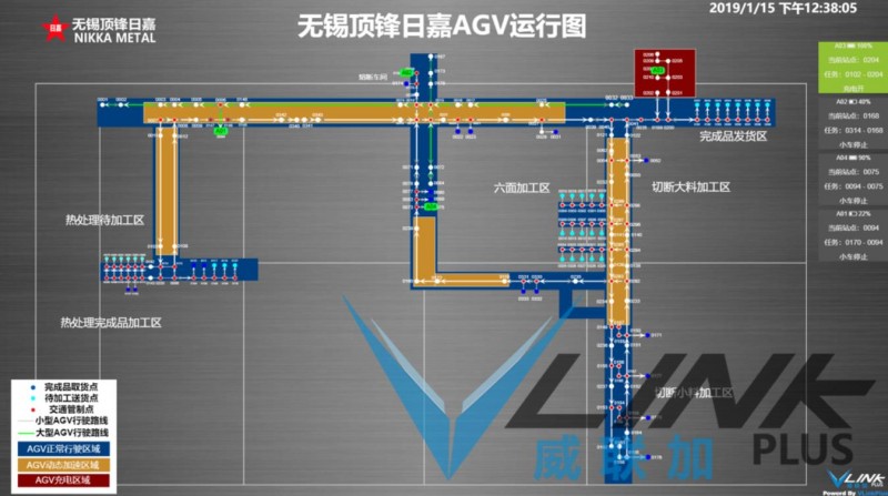 無(wú)錫頂鋒日嘉為提高物料和在制品的流轉(zhuǎn)速度,要求物料及在制品的運(yùn)輸全面采用AGV調(diào)度系統(tǒng)自動(dòng)運(yùn)輸。通過(guò)威聯(lián)加AGV智能調(diào)度系統(tǒng)的實(shí)施,實(shí)現(xiàn)AGV運(yùn)輸?shù)撵`活調(diào)度和線路優(yōu)化,大幅度提升物流的效率,實(shí)現(xiàn)快速精準(zhǔn)運(yùn)輸。路線設(shè)計(jì)根據(jù)現(xiàn)場(chǎng)狀況設(shè)計(jì)3種類(lèi)型的行駛路線:AGV正常行駛區(qū)域、AGV動(dòng)態(tài)加速區(qū)域、AGV充電區(qū)域,在行駛的路線上通過(guò)各節(jié)點(diǎn)的不同功能指導(dǎo)小車(chē)的行駛路線。