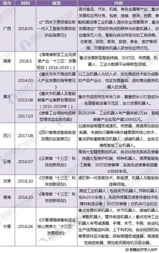 此外,還有16個省市在“智能制造”規劃、17個省市在人工智能規劃中設置了“智能機器人專項”,并且,幾乎所有省市均在戰略新興產業發展規劃、科技創新規劃、新興產業發展規劃、高端裝備發展規劃等“科技類”規劃和工業轉型升級規劃、工業和信息化發展規劃、制造業振興升級專項行動方案等“工業類”規劃中提及“機器人”。