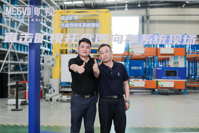 紫宸科技溧陽公司總經理南明哲(右)與曠視物流業務事業部產品業務負責人程昌順(左)在曠視四向車系統直播現場