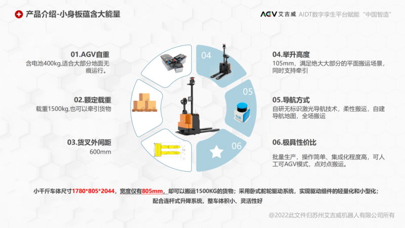 艾吉威機器人“小千斤”AGV,其設計特點手自一體多種模式,適用于物料多、載具不統一、配送作業繁忙、廠區面積大、配送距離遠、物料員作業方式不統一的制造型企業。數字化大平臺免費贈送,應用不斷免費升級,更加符合當下“數實融合”、“智改數轉”的發展大勢。“小千斤”寓意千斤重擔小意思,大平臺寓意大數據平臺支撐,應用功能免費統一升級。