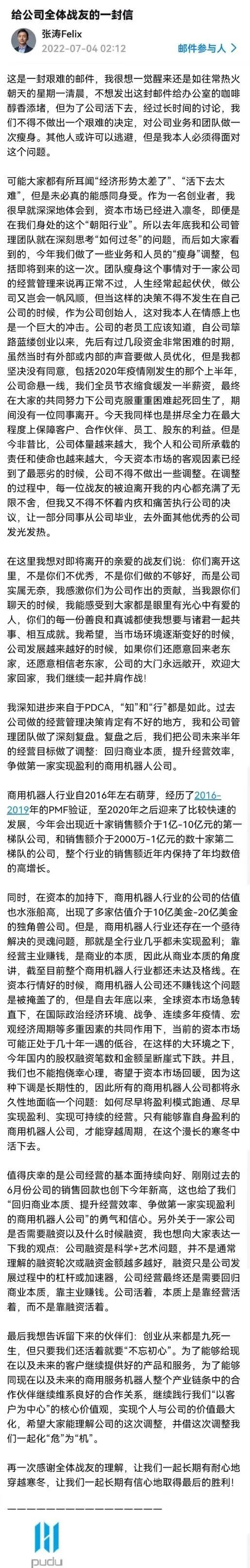 7月4日凌晨,普渡科技CEO張濤發全員信,稱為了公司活下去,經過長時間的討論,不得不做出一個艱難的決定,對公司業務和團隊做一次瘦身。