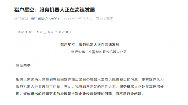 7月7日凌晨,獵戶星空在其官方公眾號上發文稱:服務機器人正處在高速增長期,媒體曝出的問題更多的應該是個別企業經營管理的問題,而不是行業問題。