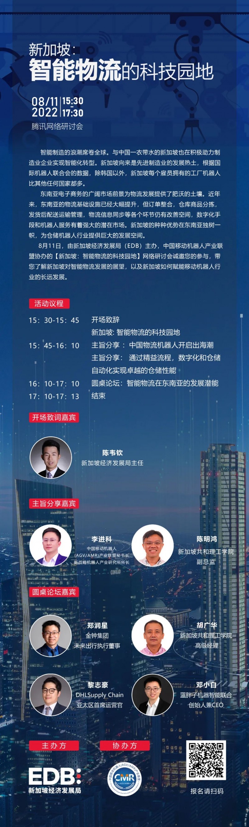 由新加坡經濟發(fā)展局 (簡稱經發(fā)局EDB) 主辦,中國移動機器人產業(yè)聯(lián)盟協(xié)辦的“新加坡:智能物流的科技園地”網絡研討會將于8月11日舉行。