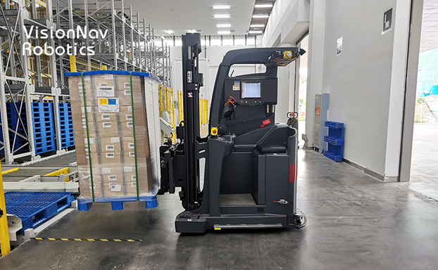 采用視覺定位導航方案:搬運的貨物為地堆型動力電池,地堆貨物進出頻繁,激光導航方案不適用。——而藍芯科技的視覺SLAM無人叉車通過3D視覺定位相機(集成定位算法)采集豐富的三維圖像信息來完成定位導航,即使地堆貨物經常變動也不影響機器人定位;