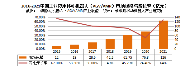 圖:2015-2021中國(guó)工業(yè)應(yīng)用移動(dòng)機(jī)器人(AGV/AMR)市場(chǎng)規(guī)模(億元)與增長(zhǎng)率