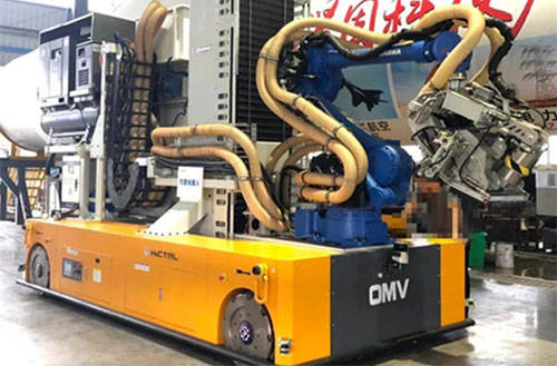 航天智造打造復合型重載AGV適用于風電行業(yè)葉片根部雙頭螺栓的安裝與檢測,實現(xiàn)了葉片自動識別型號、自動夾取螺栓、自動進行O型橡膠密封圈安裝和涂抹螺紋膠、擰緊作業(yè)、設備扭矩數(shù)據互通等智能化。