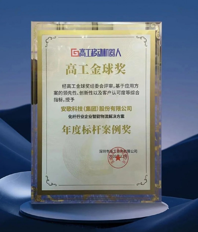 2022年12月安歌科技的化纖解決方案憑借優(yōu)秀的團(tuán)隊(duì)配合度、創(chuàng)新的技術(shù)、杰出的集成能力,以及自研自產(chǎn)的硬件+軟件+系統(tǒng)+服務(wù)的創(chuàng)新集成模式,榮膺2022化纖行業(yè)企業(yè)智能物流解決方案 年度標(biāo)桿案例獎(jiǎng)。