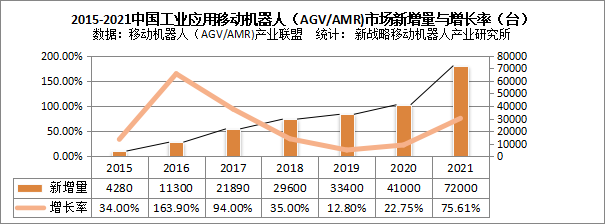 2015-2021中國市場企業工業應用移動機器人(AGV/AMR)新增量(臺)與增長率