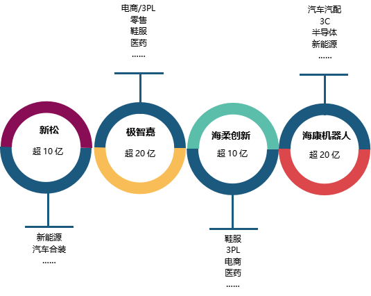 2022年中國工業應用移動機器人(AGV/AMR)市場呈現出高速增長,在一些細分與創新領域應用超過預判。其中,部分創新型企業及品類專長的企業發展勢頭驚人,增長幅度呈現單倍或多倍增長。2022年中國工業應用移動機器人市場有四家企業業務訂單額跨過了十億門檻。分別是新松機器人、極智嘉、海康機器人以及海柔創新。