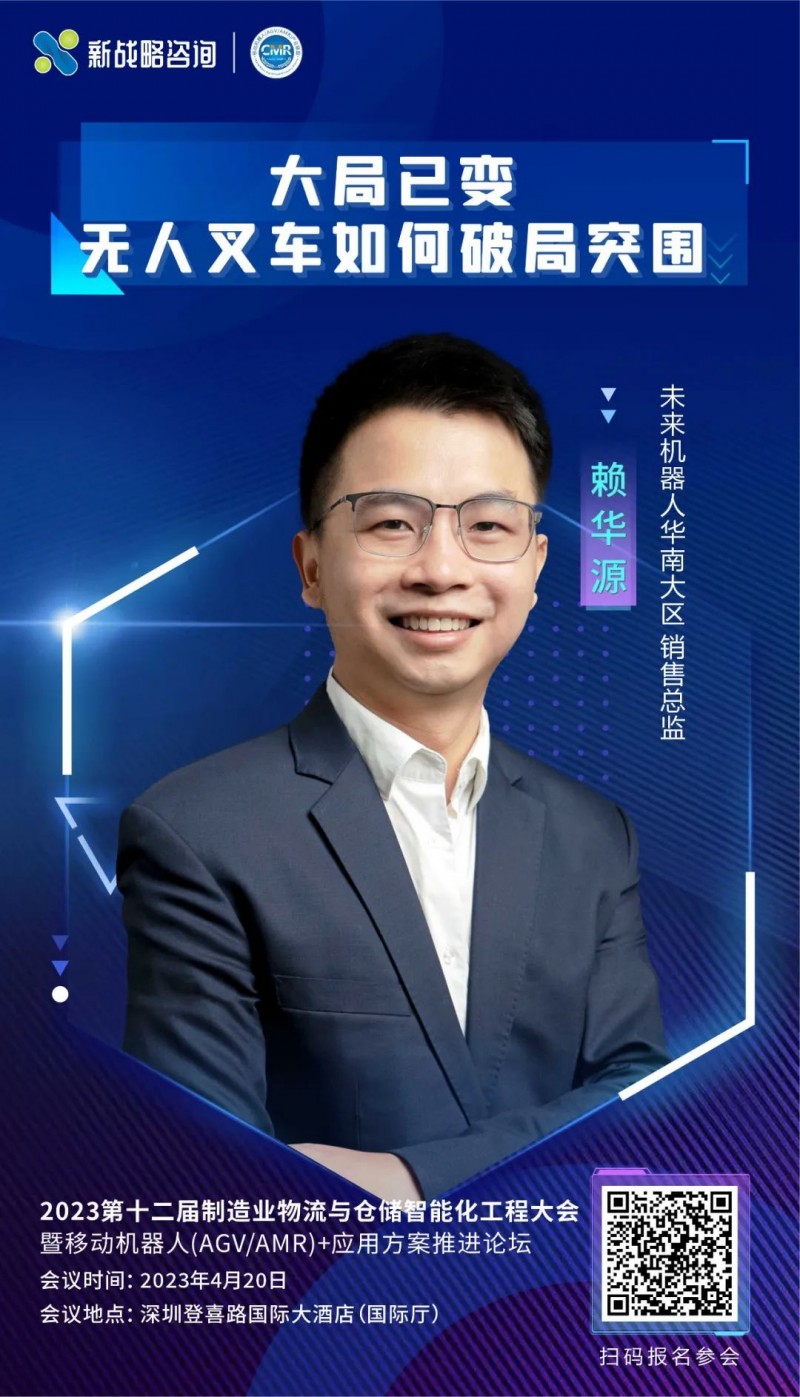 4月20日,在由新戰略移動機器人以及新戰略咨詢聯合主辦的2023第十二屆制造業物流與倉儲智能化工程大會上,未來機器人華南大區銷售總監賴華源將帶來“大局已變,無人叉車如何破局突圍”主題演講,敬請關注!