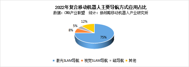 按照導航方式分,2022年,以激光SLAM為主的自然導航復合移動機器人是依舊應用主流,占比為75%,主要原因在于,復合移動機器人應用的主要領域,半導體、3C以及巡檢都對機器人的柔性化要求較高,因此,基于激光SLAM的自然導航應用較多;視覺導航應用比例為8%,相對激光SLAM來說,視覺SLAM由于起步晚,成熟度稍有欠缺,不過也出現了一些比較優秀的企業,如藍芯科技等。其次,在一些工位移動路線比較固定的場景,磁導復合移動機器人也有一些應用,占比為5%。