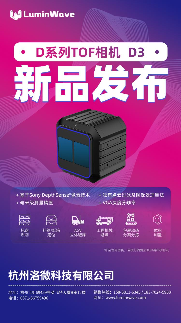 近日,洛微科技對外發(fā)布新款高性能D系列 TOF相機D3,這是一款專為工業(yè)環(huán)境中高性能操作設計的3D TOF智能相機。
