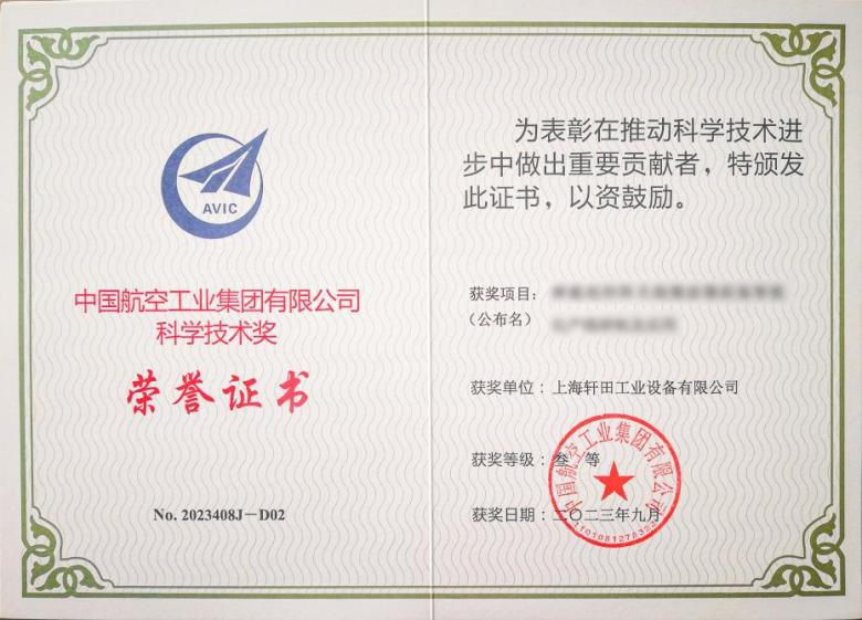 憑借持續(xù)技術(shù)創(chuàng)新能力、研發(fā)能力和技術(shù)領(lǐng)先能力,軒田科技榮膺中國航空工業(yè)集團(tuán)有限公司“科學(xué)技術(shù)獎(jiǎng)”。