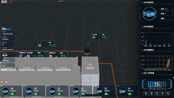 在某流通應(yīng)用場景中,海康機器人的數(shù)字孿生平臺采用先進的“一屏多顯”技術(shù),能夠在一個界面上同時展示多個外部系統(tǒng)的統(tǒng)計數(shù)據(jù),用戶能夠迅速獲取并分析關(guān)鍵數(shù)據(jù),從而更好地監(jiān)管生產(chǎn)線的運行狀態(tài),確保生產(chǎn)過程的高效和順暢。