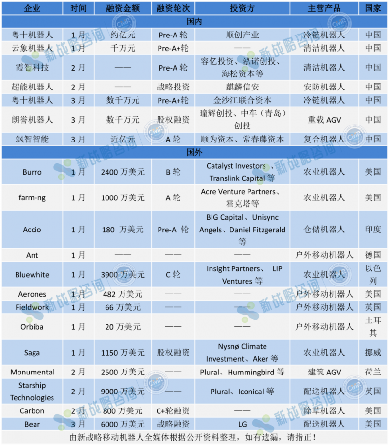 從時(shí)間分布來(lái)看,Q1全球移動(dòng)機(jī)器人融資事件發(fā)生集中在1月,融資事件11起,融資總額約7.7億元;2月出現(xiàn)較多大筆融資,融資事件5起,資金總額約9.1億元;3月融資數(shù)量和融資金額均有所回落,融資數(shù)量4起,融資總額約5.5億元。
