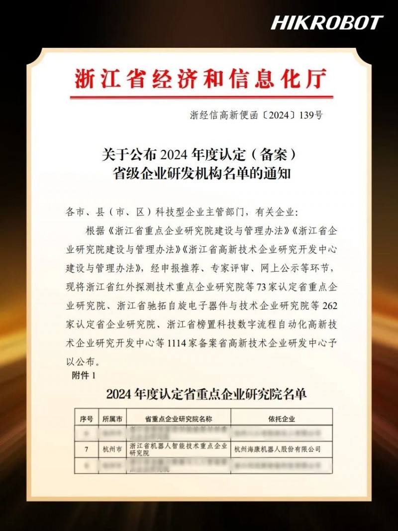 近日,浙江省經濟和信息化廳發布《關于2024年度認定(備案)省級企業研發機構名單的通知》,其中海康機器人“浙江省機器人智能技術重點企業研究院”成功通過浙江省經濟和信息化廳的審核、評審及公示等環節,被認定為“浙江省重點企業研究院”。
