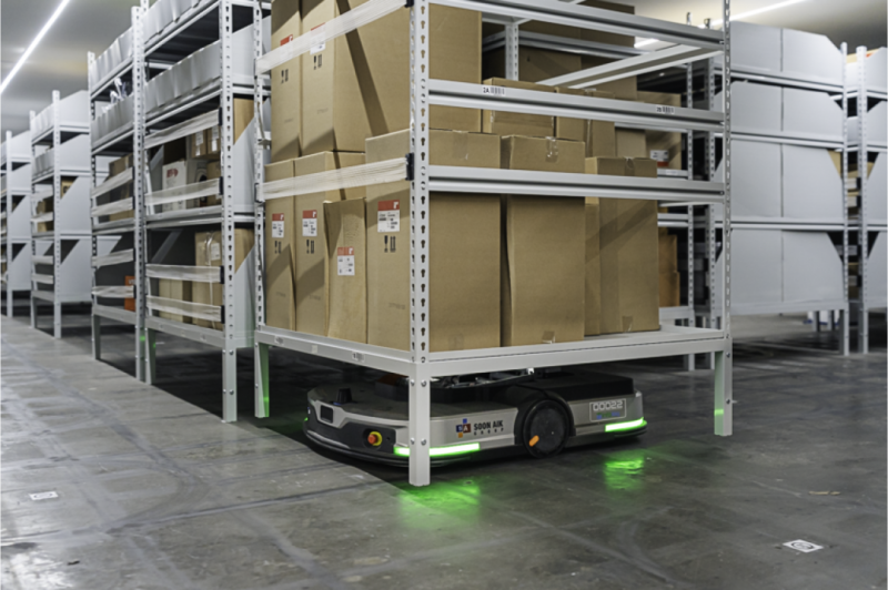AMR在倉庫三個平臺層間靈活穿梭搬運貨物,充分挖掘了倉庫的垂直空間潛力,實現(xiàn)空間的最大化利用。