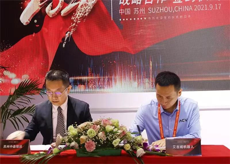 9月17日,蘇州艾吉威機器人有限公司(以下簡稱“艾吉威”)在2021全球人工智能產品應用博覽會現場完成新一輪融資簽約。在蘇州政府領導、企業(yè)合作伙伴、各行業(yè)精英代表及知名媒體的共同見證下,本輪投資方華鑫證券與中鑫資本代表孔勇軍先生、官子安先生,艾吉威機器人創(chuàng)始人劉勝明先生、聯合創(chuàng)始人司秀芬博士出席簽約儀式并鑒約。