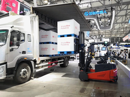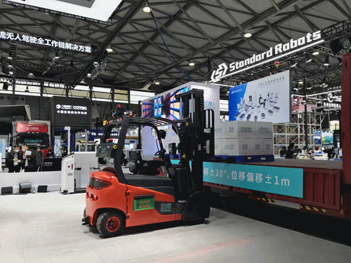 E系列及P系列視覺無人叉車,并現場演示了室內外裝卸貨車方案,其在復雜多變環境下的峰值工作效率與人工叉車可比擬。