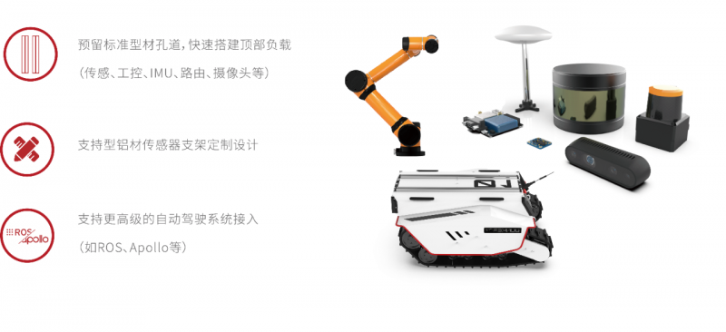 可以說,BUNKER Pro提供了在野外、箱涵、石泥路等高挑戰(zhàn)性環(huán)境下最佳的移動開發(fā)平臺,助力機器人行業(yè)和科研客戶快速部署和開發(fā)特殊作業(yè)機器人,諸如巡檢、勘探、消防、特種拍攝、特種運輸?shù)葢谩?/section>BUNKER Pro外觀結構全新設計,車身重心位置低,裝置了1500W雙伺服電機進行驅動,極具越野性。此外,其采用了克里斯蒂懸掛和瑪?shù)贍栠_四輪平衡多懸掛系統(tǒng)組合,并于全車安裝了加強版避震器和防撞擊結構組件,外觀采用了高強度和大厚度的鋼材,這為執(zhí)行特種作業(yè)應用提供了可靠的減震系統(tǒng)性能。 目前,BUNKER Pro最高越障可達18cm,爬坡度為<=30°,這意味著面對野外坡道和廠區(qū)樓梯,BUNKER Pro都可以一舉輕松爬越和穩(wěn)定運行。BUNKER Pro驅動形式為履帶差速轉向和左右獨立驅動,自研運動控制系統(tǒng)電機采用了2500線光電增量式碼盤,可以在復雜道路中實現(xiàn)高精度的控制,并且可以柔性實現(xiàn)0轉彎半徑原地自旋。BUNKER Pro外觀配置了防撞耐用的鋼質(zhì)結構, 且整車結構、材料以及外置電氣元件均采用均采用高防護等級設計,達到了IP67安全標準,這是市面上同級別綜合路況移動平臺中防護等級最高的。其具備沙塵滲透防護、移動涉水和短暫浸泡防護(防浸)等優(yōu)勢,無懼任何潮濕、涉水、越野等極限工作環(huán)境,可以保證BUNER Pro極大拓展機器人的使用場景。基于高等級防護、模塊化和精簡部件結構設計,BUNKER Pro車體后期清潔也是十分便捷的,不藏污垢,不易腐蝕,易于維護。BUNKER Pro平臺空間大,可以在原地自旋過程中達到120kg載重,這意味著可以輕松搭載各類檢測設備。用戶可通過CAN總線協(xié)議與主控通訊,快速接入傳感系統(tǒng),搭建自主應用開發(fā)平臺,同時,BUNKER Pro也支持定制高級操作模式(遠程駕駛/自動駕駛),提供開源SDK、ROS_PACKAGE。BUNKER Pro還具有大電池容量,可在常規(guī)路面載重120kg運行情況下支持3小時續(xù)航, 也可對搭載的傳感器等外部設備進行供電, 為機器人應用的作業(yè)提供充足和便捷的運行保障。