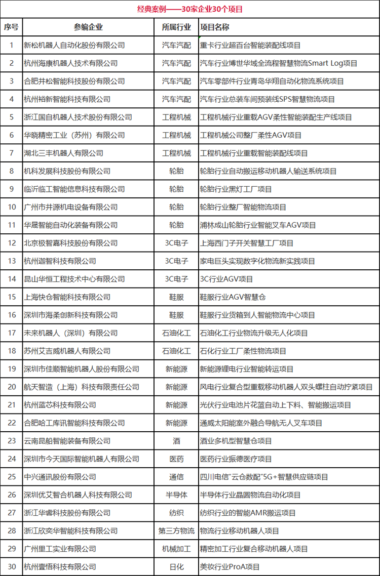 為了更好的宣導和展示從91年國產AGV落地應用以來在各行各業的經典案例,以及將案例與技術相結合,凸顯行業前瞻技術的論文集萃。中國移動機器人(AGV/AMR)產業聯盟與新戰略移動機器人產業研究所聯合出版了《中國工業應用移動機器人經典案例匯編及技術發展論文集(2021版)》。具體入選案例名錄如下: