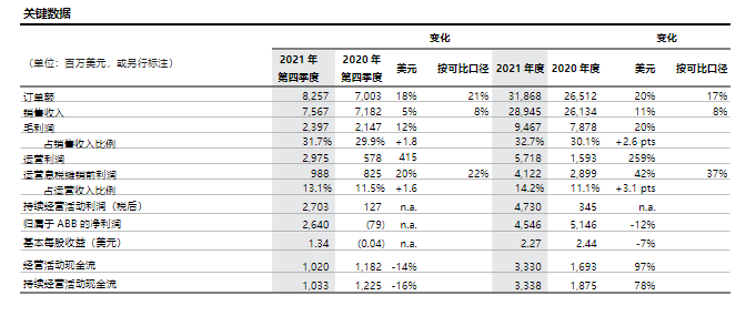根據(jù)ABB發(fā)布的2021年第四季度及全年財(cái)報(bào)顯示,2021年全年,ABB訂單總額為319億美元,同比增長20%,按可比口徑增長17%;銷售收入為289億美元,同比增長11%,按可比口徑增長8%;運(yùn)營利潤為57.18美元,利潤率為19.8%。